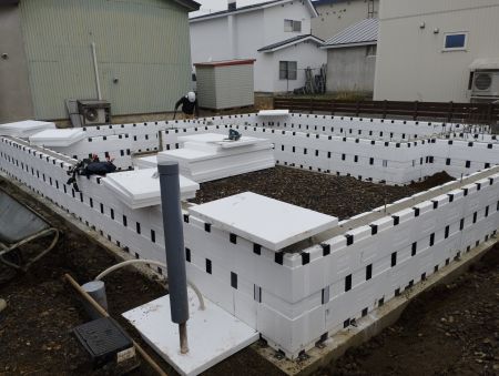 それでは早速ですが、現場工事進捗状況になります。 美瑛のお家では、 先日、かんたんベース(断熱型枠)が行われました。